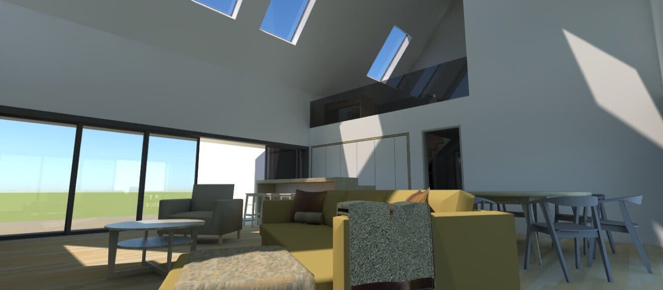 The large mezzanine landing has enough room to be an office and enjoys views through the glazed living area gable and down into the double height Kitchen/Living/Dining Area. The mezzanine also obscures the view of the double height space when you enter through the front door meaning you do not experience the full effect of the space until you walk up the stairs, or until you pass under the mezzanine in to the double height space, adding a sense of drama.