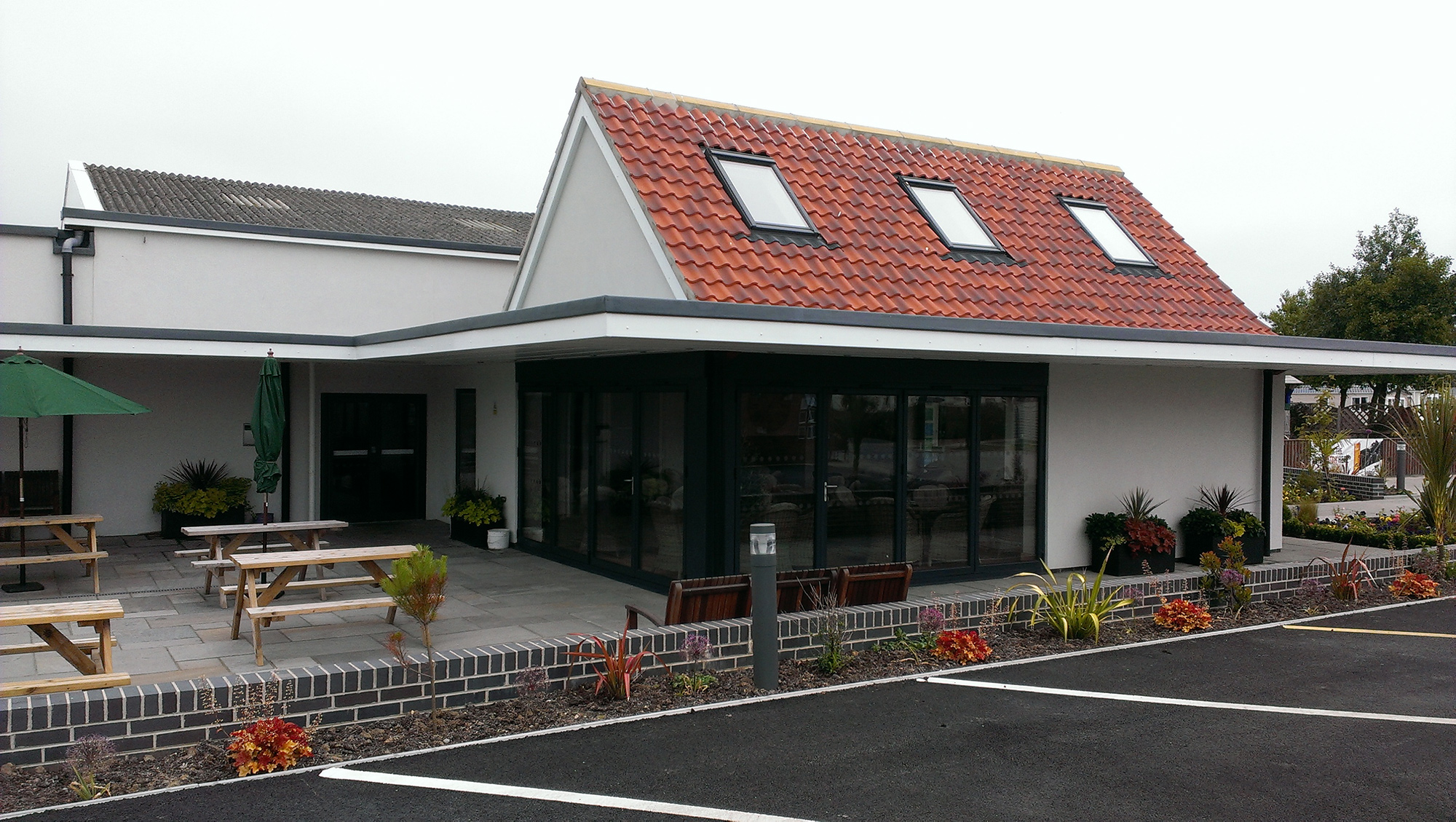 GBA proposed a new south facing dining area extension on the south elevation. This will incorporate a new more visible and inviting entrance and will be set in a new landscaped beer garden with a new play area. The new area will allow patrons to take advantage of the south facing aspect and the new open plan layout will allow the interior and exterior spaces to feel more cohesive. Due to its southern aspect we have proposed a large overhang to allow for shade within the new area.